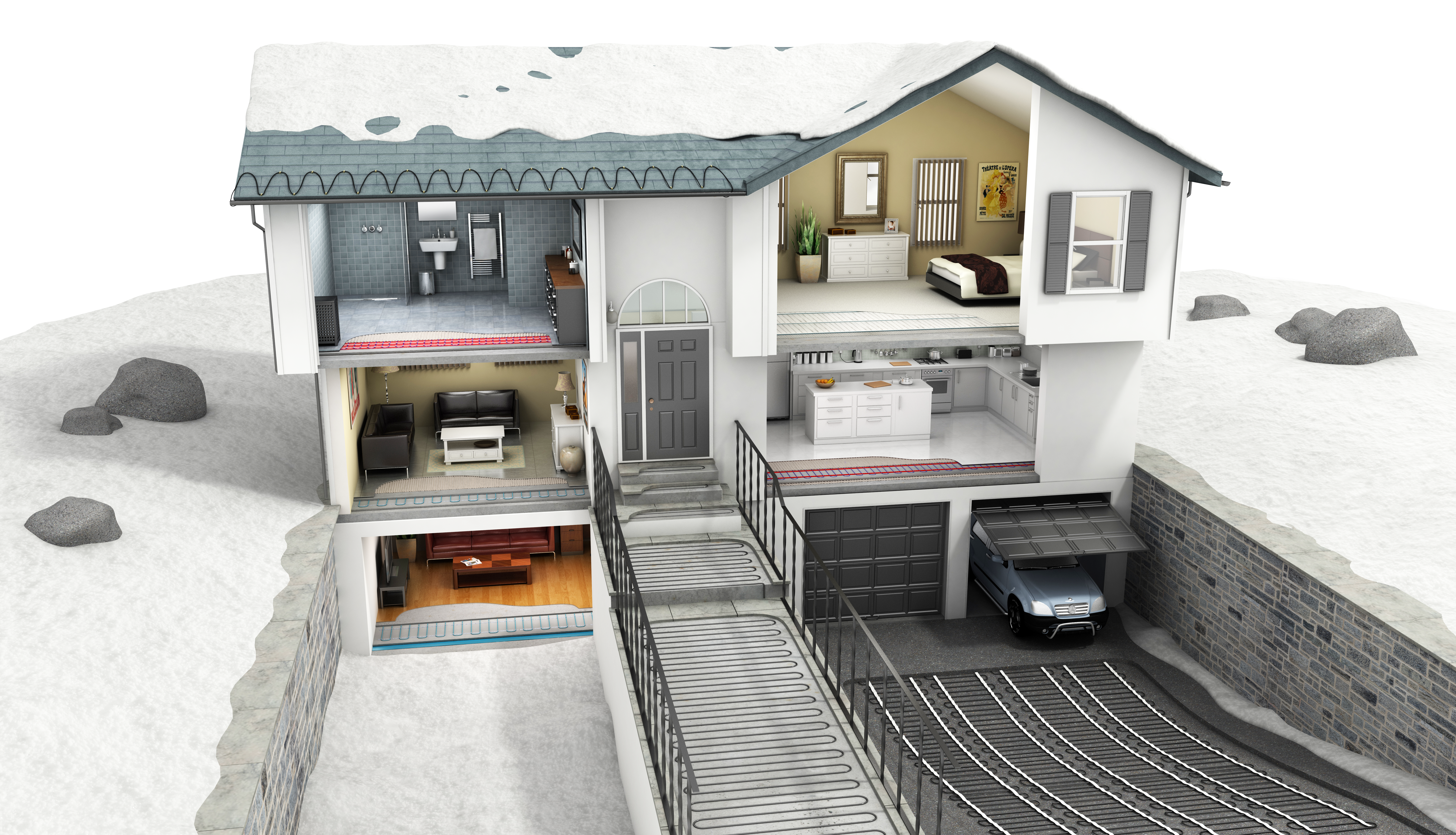 Bruker både hydroniske og elektriske usynlige varmesystemer
